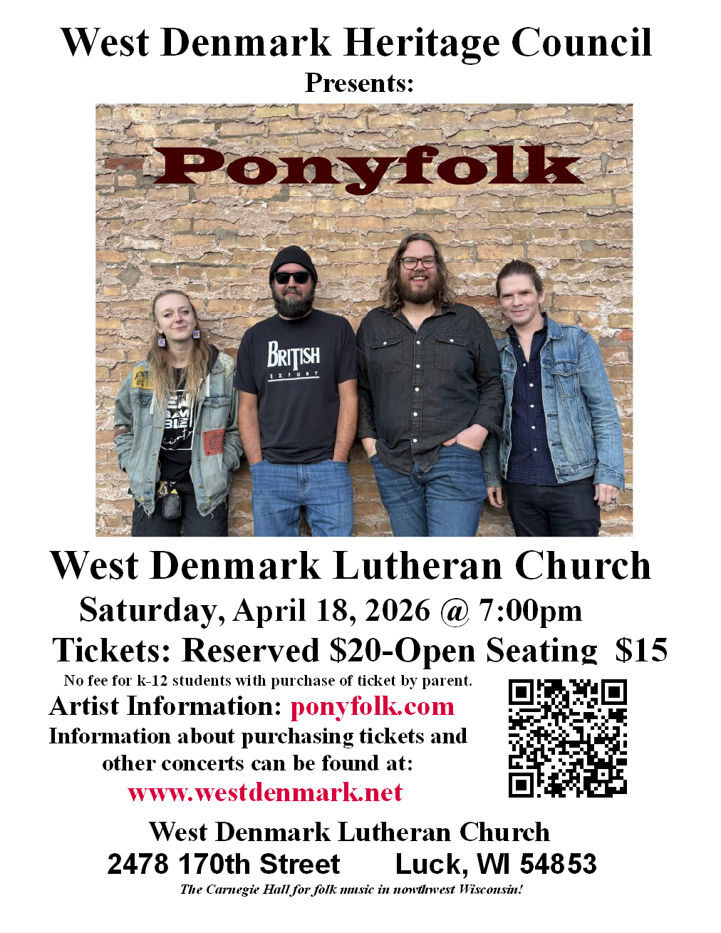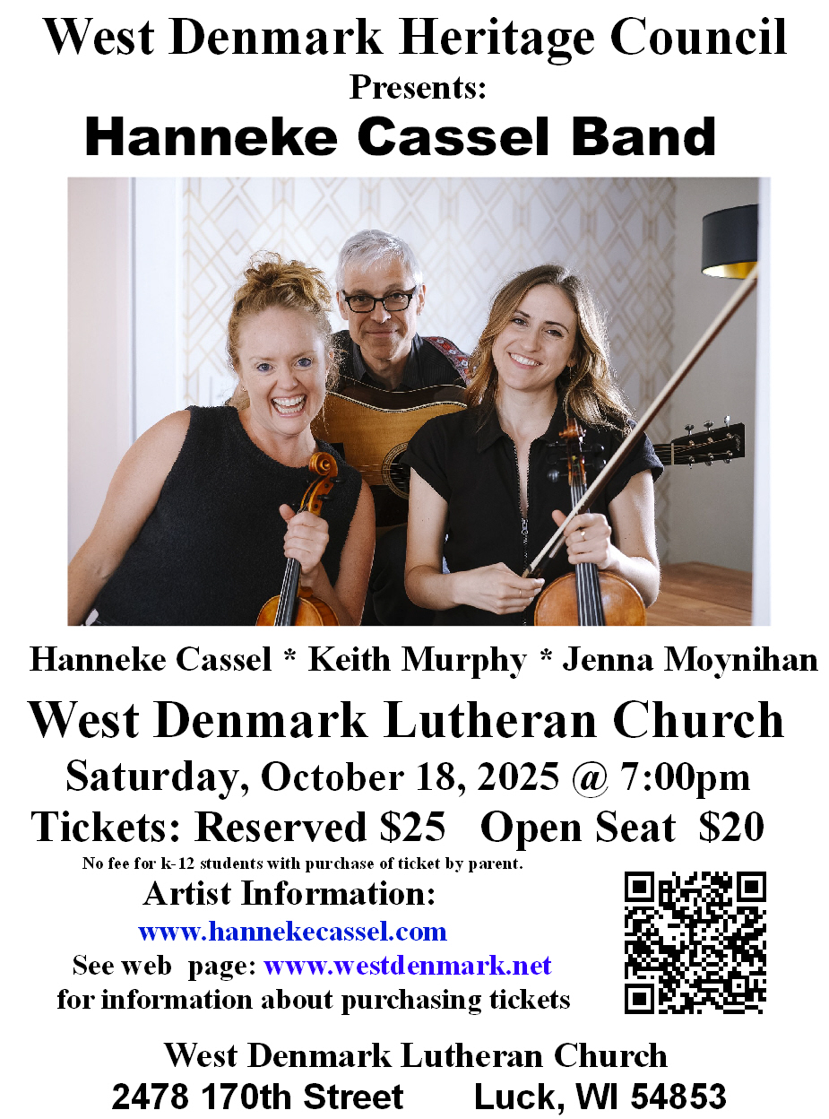 Mads Hansens Kapel will be at the West Denmark Lutheran Church on Thursday, October 12, 2023 at 7:00 pm. These young musicians are extremely talented and make for an energetic evening of music. And will be performing mainly music from their home country of Denmark. You will find that their arrangements of traditional Danish music will be fun to listen and you will enjoy their wonderful musicianship. Their instrumentation is clarinet, fiddle, bass, keyboard, and guitar. You can purchase your tickets by credit card in advance by clicking on the link below or scanning the QR code. The first 40 people to purchase tickets will get reserved seating in the first 3 rows. All other advanced seating will be first come first served.