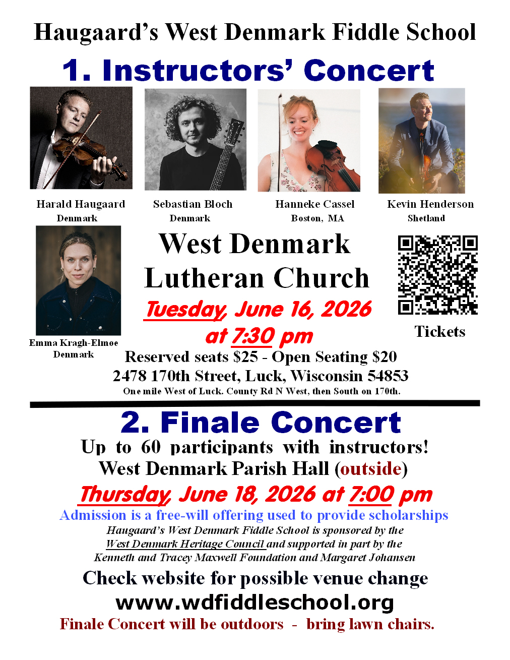 There will be 100 advance tickets available for the Instructors' Concert. 40 of those tickets are reserved seats in the first 3 rows.Advance purchase is recommended. If you purchase tickets in advance you will get a receipt. Please print out the ticket or save it on your cell phone and bring it with you to the concert. If you purchase one of the 40 advanced reserved seat tickets, which will be located in the first 3 rows, you will get an additional email confirming your purchase and the location of your seat. Please note that when you use this credit card service there is an option, if you choose to do so, to make a tax deductible donation to the West Denmark Heritage Council and another option to donate to the service for the convenience for you to pay by credit card.